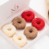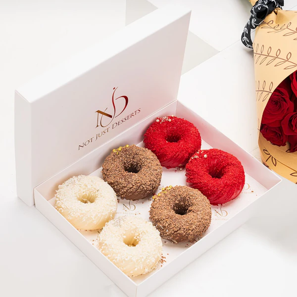 افتح صندوقًا صغيرًا مليئًا بالاحتفالات مع صندوق الميني كيك من نوت جست ديزرت! ستة ميني كيك على شكل دونات، كل منها مليئة بنكهة مختلفة - شوكولاتة غنية، وفانيليا كلاسيكية، وريد فيلفيت لذيذة - توفر رحلة مذاق مرحة ولذيذة.