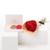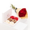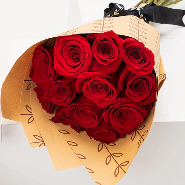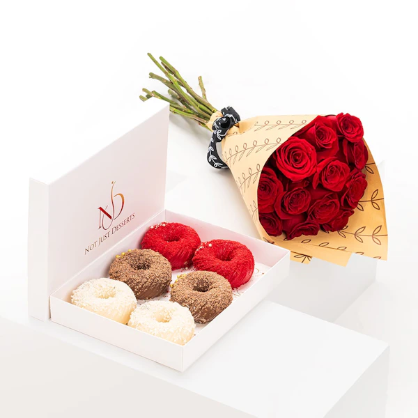 ولكن الحلاوة لا تتوقف عند هذا الحد! باقة بسيطة وأنيقة من الورود الجورية الحمراء الكلاسيكية، مقدمة بشكل جميل في غلاف بني مميز من فلاورد، تضيف لمسة من الرومانسية الخالدة إلى التجربة.