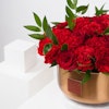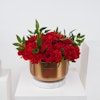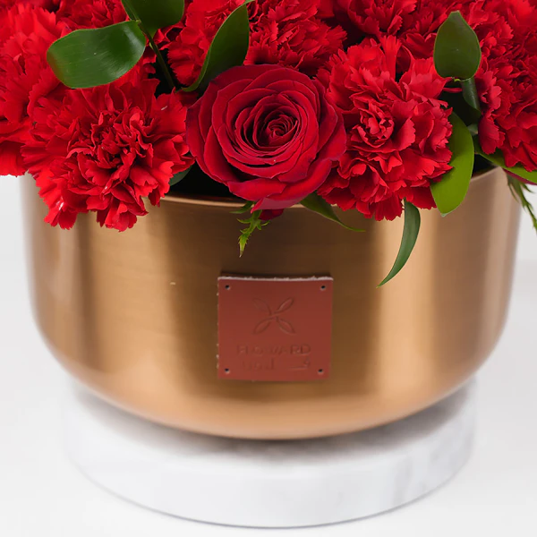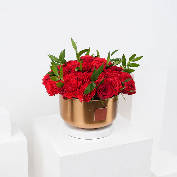 نقدم لكم هدية  الأحمر الأنيق، يتميز هذا الترتيب بباقة كبيرة من الجورى الحمراء و الكارنيشن الأحمر وأوراق فريش مرتبة في مزهرية ذهبية مذهلة بقاعدة رخامية. مزيج مثالي من الفخامة والأناقة، من المؤكد أن هذا الترتيب سيعطي انطباعًا ويضيف لمسة من الفخامة إلى أي غرفة. أظهر ذوقك الذي لا تشوبه شائبة وثق بخبرة التصميم لعشاق الموضة والمصممة المعتمدة سوسن القاضي من خلال إهداء هذه الباقة الفريدة والرائعة.