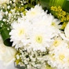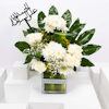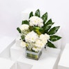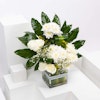 إناء جميل يحتوي على ترتيب بسيط من الورود البيضاء ، والجبسوفيلا البيضاء ، والأقحوان البيضاء مع أراليا الخضراء ، والدراكينا الخضراء ، والأسبيديسترا الخضراء.