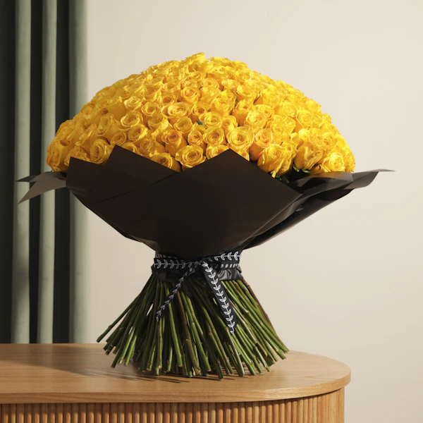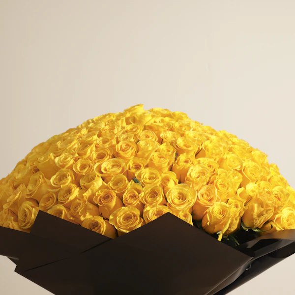 أضف لمسة من التميز والأناقة مع باقة جوري أصفر في غلاف أسود، التي تجمع بين التألق والجاذبية في تنسيق رائع. يتميز الجوري الأصفر بألوانه النابضة بالحياة التي تجلب الفرح والإشراق، بينما يضيف الغلاف الأسود لمسة من الفخامة والغموض. تُعد هذه الباقة خياراً مثالياً للتعبير عن مشاعر التقدير والحب، وتمنح كل مناسبة لمسة من الرقي والتميّز. اختر باقة جوري الأصفر في غلاف أسود لتجعل كل لحظة أكثر إشراقاً وتترك أثراً دائماً في قلوب الأحبة اطلب الآن لتستمتع بهذه الزهور الرائعة وتضيء يوم أحبائك.