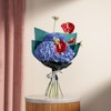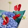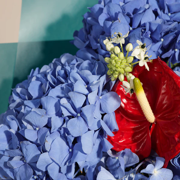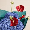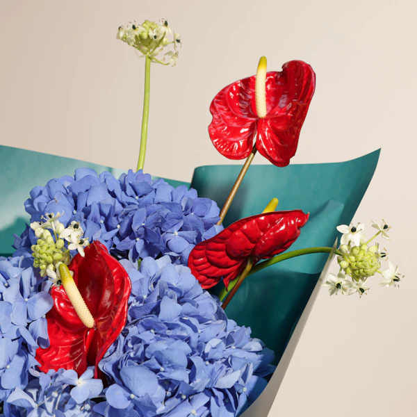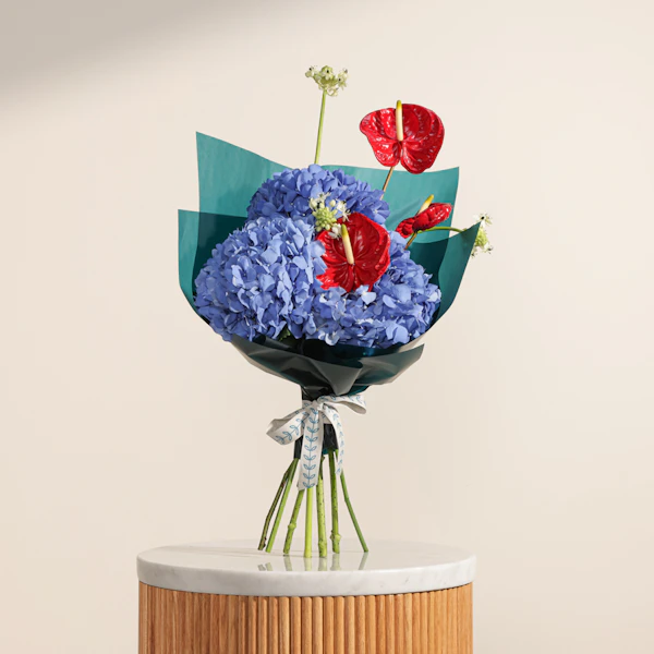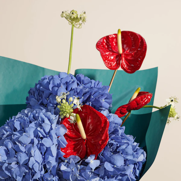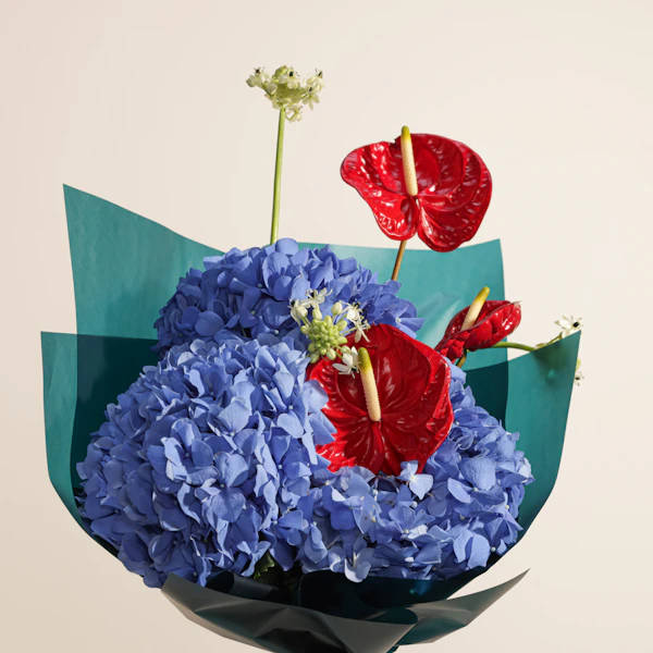 تألق مع هذه الباقه المميزة التي تجمع بين الأناقة والجمال استمتع بجمال الهيدرانجيا الزرقاء الساحرة، التي تعكس الهدوء والرقي، والأنثريوم الأحمر الجريء، الذي يضيف لمسة من الفخامة والحيوية. جميعها مغلفة بأناقة في غلاف أخضر داكن، لتكون هديتك مثالية وتلفت الأنظار بكل تميز. اجعل لحظات أحبائك أكثر تألقًا مع هذه الباقة الرائعة