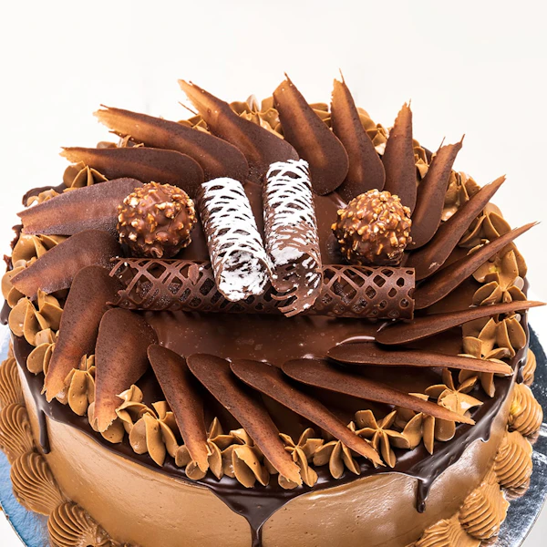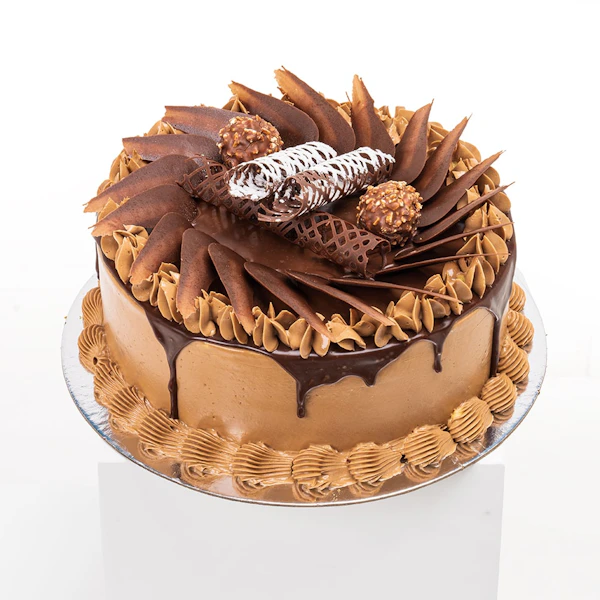 مزيج رائع من كعكة الشوكولاتة الرطبة ، صقيع الشوكولاتة بالبندق ، وشوكولاتة فيريرو روشيه ، مما يخلق متعة رائعة لعشاق الشوكولاتة والبندق