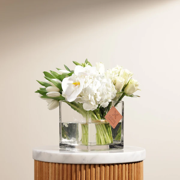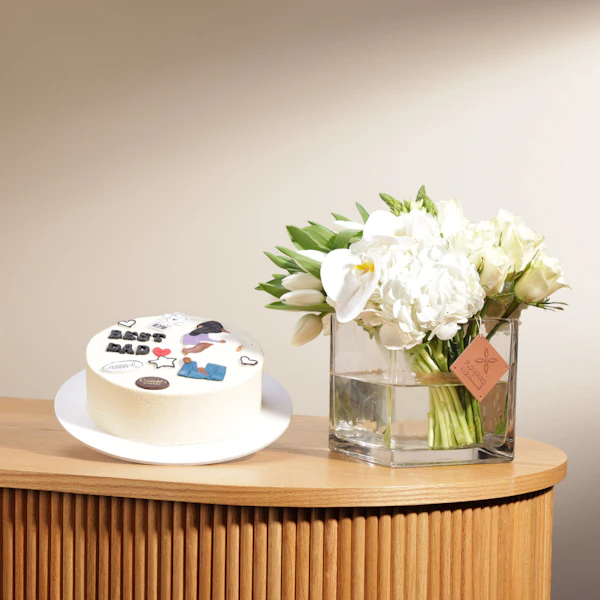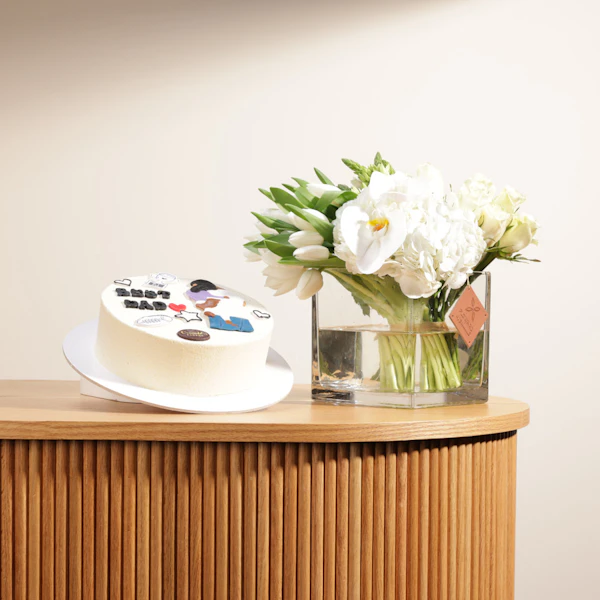 SKU FC98551في لحظة الاحتفال بهذه المناسبة الخاصة، هدية مميزة تعبر عن مشاعر الامتنان والحب. كيك كرامبلز بطعم الشوكولاتة المنعشة والكرسبي تضفي لمسة من اللذة والبهجة. وبجانبها، مزهرية زجاجية تحتضن جمال الطبيعة بتوليب أبيض وهيدرانجيا وجوري وزهرة النجوم البيضاء، تعكس بريق السعادة والنقاء. إنها هدية تجمع بين متعة الطعم وجمال الزهور، معبرة عن أعماق الاحترام والتقدير لأفضل أب.