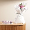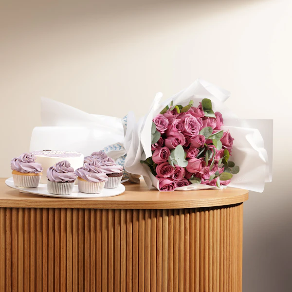 استمتع بحلاوة الاحتفالات مع كيك عيد ميلاد سعيد من كرامبلز المشهية، وهي هدية لذيذة تزن 200 جم، ومجموعة من 5 كب كيك لذيذة للغاية. مقترنة بشكل مثالي مع باقة ساحرة من الجوري البنفسجية، مغلفه بأناقة بغلاف باللون الأبيض، هذه الهدية مؤكدة أن تجعل أي عيد ميلاد خاص إضافيًا. سواء كنت تفاجئ صديقًا أو فردًا من العائلة أو زميلًا، فإن تركيبتنا من الحلويات اللذيذة والزهور الجميلة هي الوصفة المثالية للفرح والسعادة. اطلب الآن وانشر السعادة في يومهم الخاص!