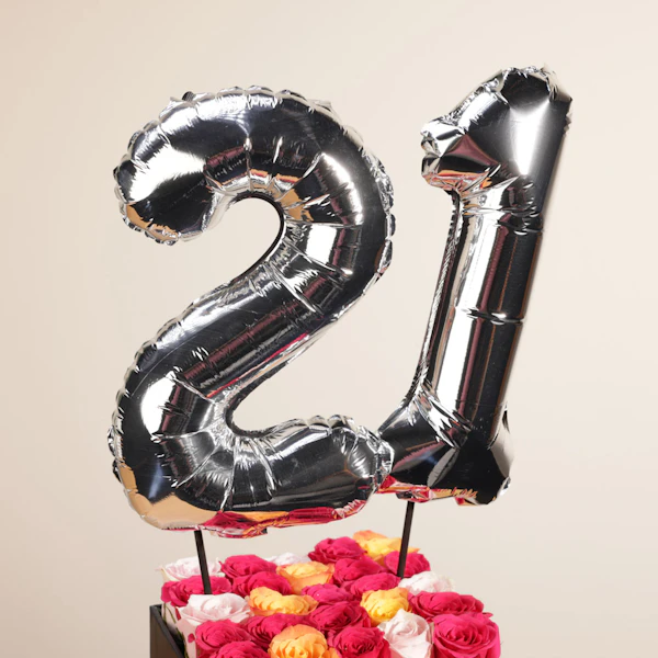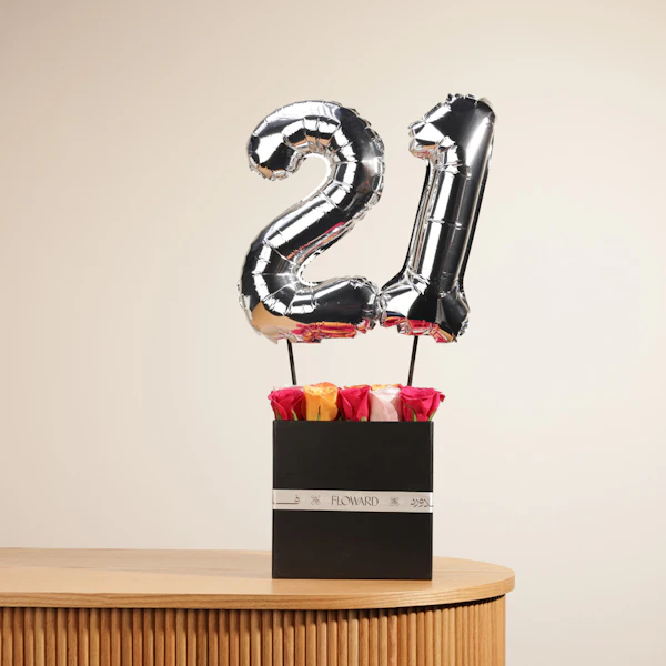 اجعل عيد ميلادك الـ 21 لا يُنسى مع بوكيه زهور الجوري الفاخر. يضم هذا الترتيب الرائع تشكيلة متنوعة من زهور الجوري المميزة: جوري فوشيا، جوري وردي، جوري برتقالي. كما يتضمن الترتيب بالون رقم 1 وبالون رقم 2، كلها مرتبة بعناية في صندوق جوري مربع محفوظ أسود أنيق.اطلب أجمل زهور الجوري اليوم واجعل مناسبتك أكثر تألقًا وسحرًا. احجز أسرع توصيل ورد الآن لتضفي لمسة من الفخامة والرومانسية على احتفالك الخاص. اطلب الآن لتضمن الحصول على أجمل وأحدث الزهور في أسرع وقت ممكن.لا تفوت فرصة إبهار أحبائك بأجمل زهور الجوري في عيد ميلادك الـ 21. احتفل بأسلوب يليق بك واجعل هذه اللحظات لا تُنسى مع زهور الجوري الفاخرة.