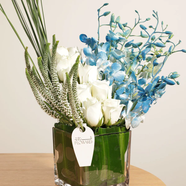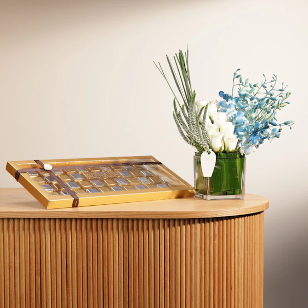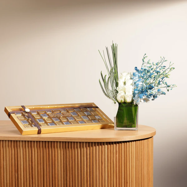 SKU FC06836اجعل هدية منزلهم الجديدة تكون لحظة استقبال رائعة مع علبة شوكولاتة منزل مبارك من غزل، تحتوي على 44 قطعة من الشوكولاتة اللذيذة، كل منها يقدم نكهة فريدة ورائعة. ولإضفاء المزيد من البهجة والجمال، أضف ترتيباً ساحراً من الزهور، بجوري أزرق وبيبي أوركيد أبيض، مرتبة في مزهرية زجاجية مربعة. هذه الهدية الراقية تعكس مشاعر التهنئة والفرح بالمناسبة الجديدة، لتجعلها لحظة تفتح الأبواب لذكريات جميلة وسعيدة في المنزل الجديد.