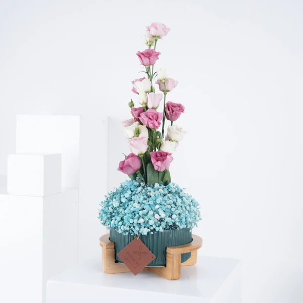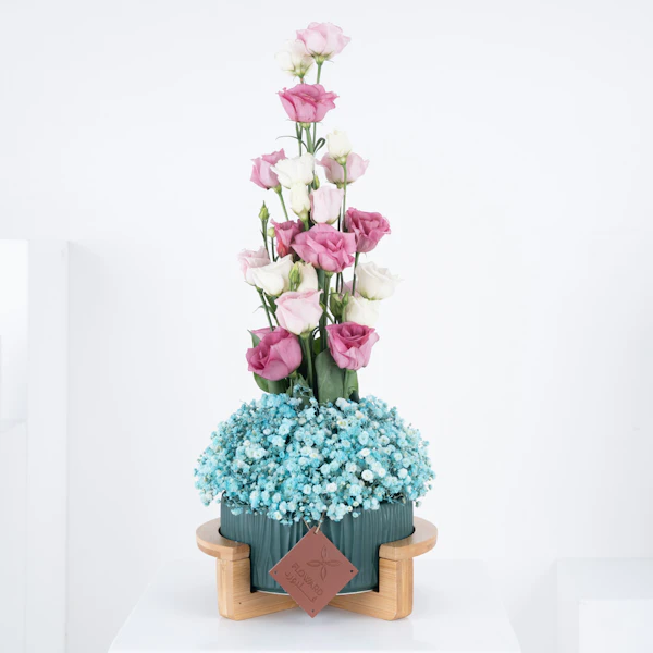 يقدم هذا الترتيب الجميل، المصصم بواسطة المصممة جيهان، لوحة ألوان زهور حديثة لتكون هدية مثالية لالتقاط اللحظة ورؤية ابتسامة كل من تحب لبقية اليوم.
