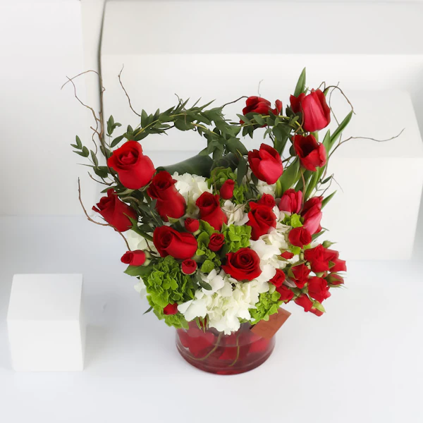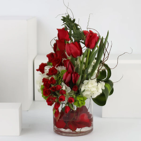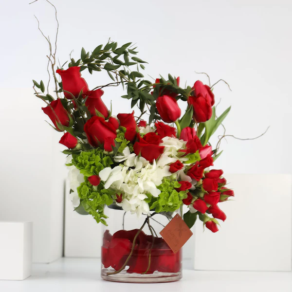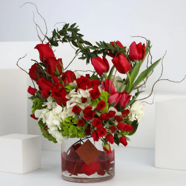 BHD46ستحمل هذه الفازة الأنيقة مشاعر الوِّد والمحبة لأحبتك، فهي تتميز بالتناغم بين زهورها رائعة الجمال. فالزهور تم تنسيقها داخل المزهرية بنعومة وأنسيابية لا متناهية تزيد الورود سحراً وجاذبية. هذه المزهرية الجميلة ستكون أضافة رائعة لأي غرفة لما تشعه من جمال والأناقة، مما يجعلها من ألطف ما يمكن ان تقدمه إلى من تحب.