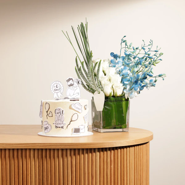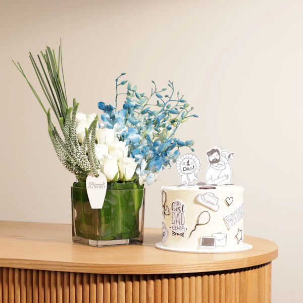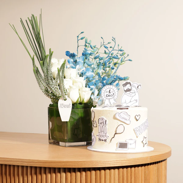 SKU FC40728احتفلوا بأفضل أب على الإطلاق مع كيك كرامبلز بالشوكولاتة الكرسبي، المزينة برسومات لطيفة تجسد حضنًا دافئًا بين الأب وابنته، مع رسالة تقول له بكل فخر أنه الأب الأفضل. هذه الهدية ليست مجرد كيك، بل تجسد لحظات من الحب والتقدير. تأتي مع الكيك باقة ساحرة من ورود الجوري الزرقاء وزهور الفيرونيكا والبيبي أوركيد البيضاء، مرتبة بأناقة في فازة زجاجية مربعة، لتكتمل بها الهدية بجمال ورونق لا مثيل لهما. دع هذه الهدية الرائعة تعبر عن مشاعرك بكل تفاصيلها الرقيقة والمميزة، واجعل الاحتفال به يبقى مميزًا وذكرى عزيزة في قلبه للأبد.