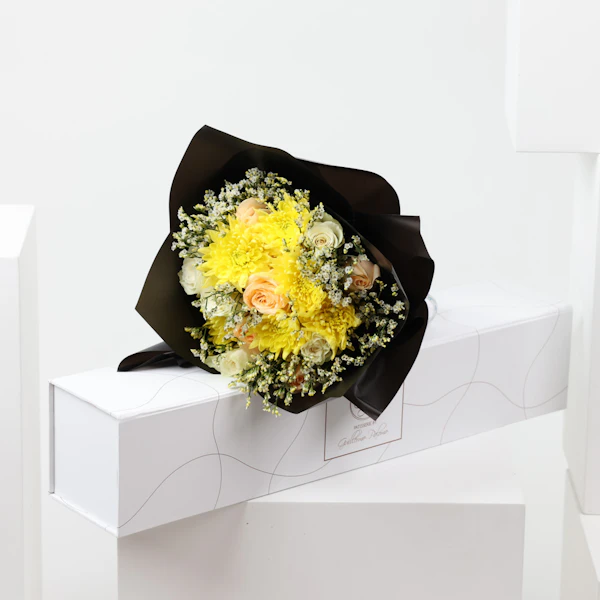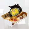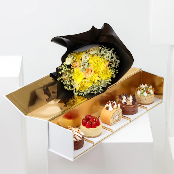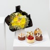 SKU FC68229استمتع بتجربة لذيذة مع صندوق كيك من باتيسيري باي جيليرمو بالومو، الذي يتضمن 5 نكهات رائعة لتثير حواسك الذواقة. تمتع بالنكهة الغنية كيك البندق البني، والحلاوة المنعشة لتشيز كيك التوت، والنكهة الشهية للتمر والكراميل، والفخامة اللذيذة لكيك الشوكولاتة، والطعم الرائع لتشيز كيك البقلاوة والفستق. مصاحبة لباقة ساحرة من الليمونيوم الأبيض، وبيبي جوري برتقالي فاتح، والجبسوفيليا الأبيض، والاقحوان الأصفر، كلها ملفوفة بأناقة في غلاف اسود انيق. مثالية للهدايا أو للاستمتاع بتجربة حلوى فاخرة. ارتقِ بأي مناسبة مع هذه الحلويات اللذيذة من باتيسيري باي جيليرمو بالومو.