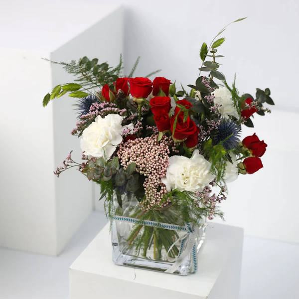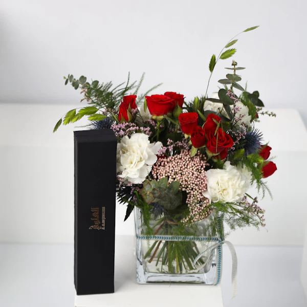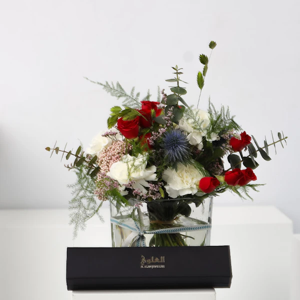 أظهر حبك لحبيبك مع هذا الترتيب الأنيق في إناء زجاجي أسطواني. يحتوي على مزيج من 5 أوكالبتوس ، 4 هليون ، ليمون ، 2 إرينجيوم ، 3 تشاسمانثيوم ، 5 قرنفل ، 4 بيبي جوري، وأوزوثامنوس ، بالإضافة إلى سوار علوي بجناح علوي عيار 21 قيراط مرصع بأحجار الملكيت الأخضر. هدية جميلة ومدروسة لتفتيح يومها.