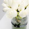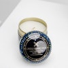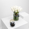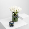 كاندل كونكشن شمعة الكتان الطازج والعنبر الزرقاء مع مزهرية ورود بيضاء