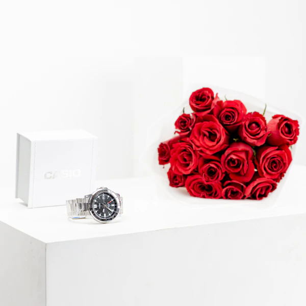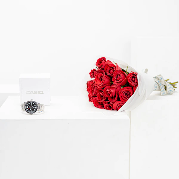 احتفلوا بالحب والوقت معًا مع هديه مميزه بعيد الحب - باقة رائعة من الجوري الحمراء مصاحبة لساعة كاسيو أنيقة. يجمع هذا الثنائي المتناغم بين جمال الورود الخالدة وأناقة ساعة كاسيو العملية. ترمز الجوري الحمراء الزاهية إلى العاطفة العميقة، في حين تضيف ساعة كاسيو لمسة من التطور. اجعلوا عيد الحب هذا لا يُنسى بتقديم هذا الجمع الساحر، تعبير فكري يجمع بين الحب وجوهر الزمن. اطلبوا الآن لتفاجئوا من تحبون بتناغم بين الورود الجميلة وإكسسوار زمني، ضمانًا لاحتفال مليء بالرومانسية والفعالية.