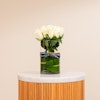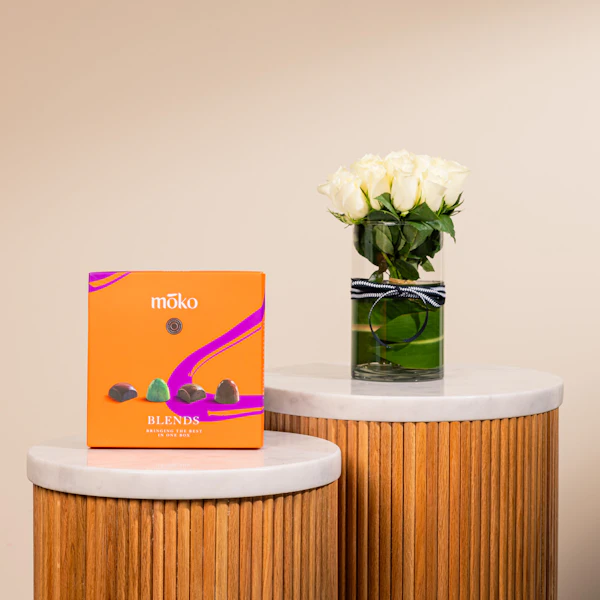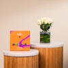 SKU FC18040صندوق الشوكولاتة من موكو يحتوي على 16 قطعة لذيذة، مصحوب بترتيب رائع من الورود البيضاء في مزهرية زجاجية أسطوانية، بمجموع 25 زهرة. تجمع هذه الهدية بين لذة الشوكولاتة الفاخرة وجمال الورود، مما يخلق لحظات فاخرة ومميزة تترك انطباعاً عميقاً. إنها خيار مثالي للتعبير عن المشاعر العميقة من الحب والامتنان، مضيفة الفرح والسعادة إلى أي مناسبة بفضل لذتها الشهية وجمال ترتيب الورود.