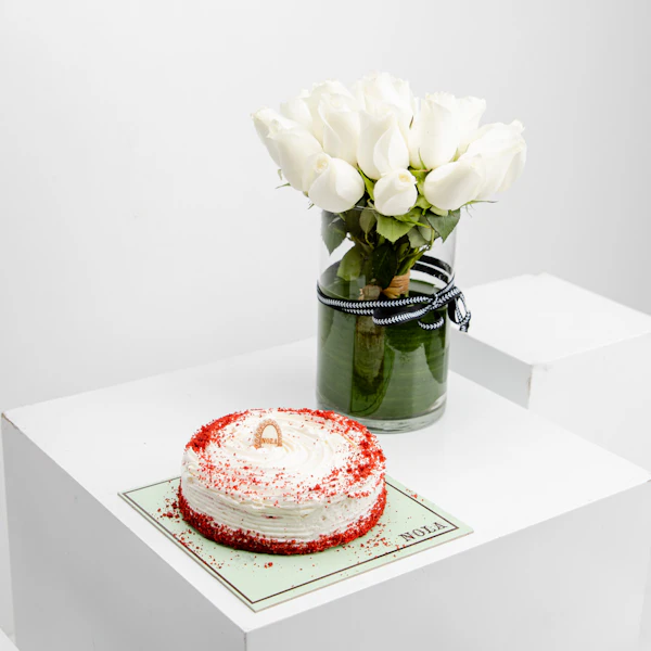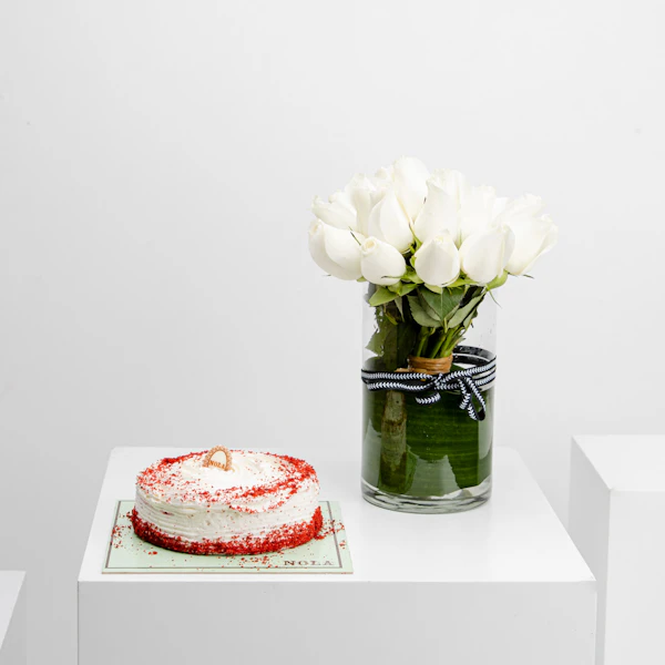 الأسعار شاملة الضرائبكيكة نولا مع مزهرية ورود بيضاء