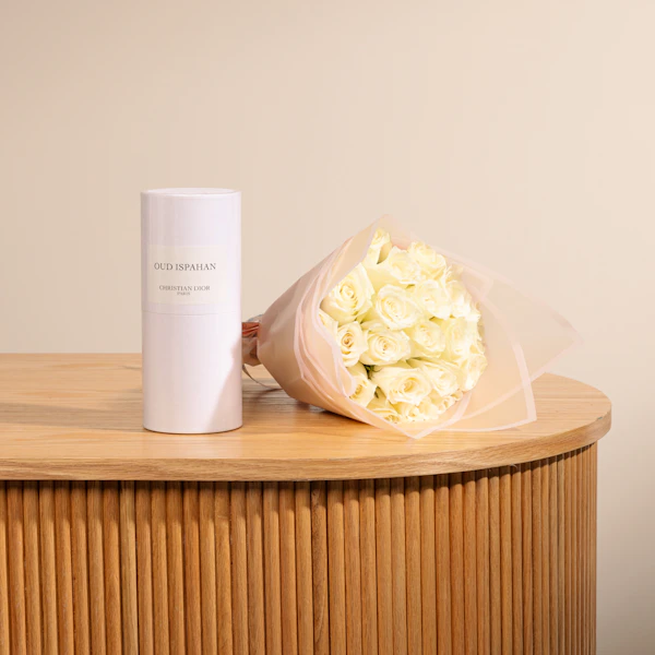 عطر عود اصفهان من كريستيان ديور للجنسين 250 مل مقترن بباقة جوري أبيض
