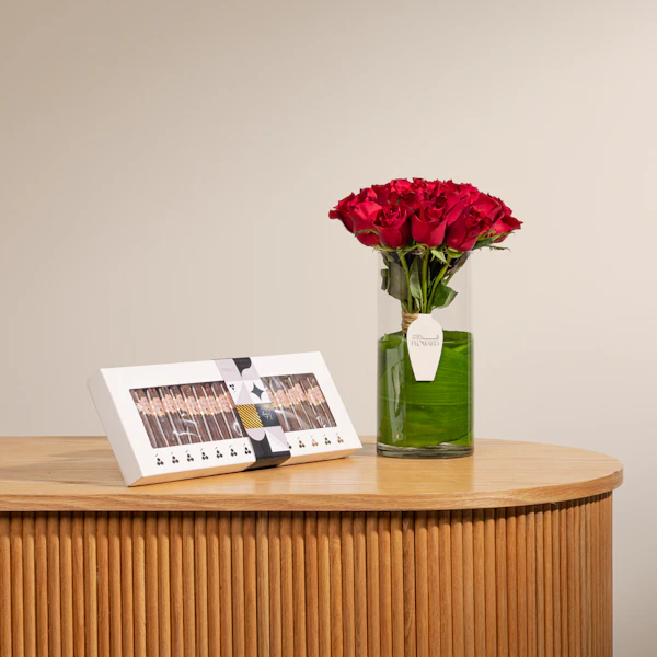 الأسعار شاملة الضرائبصندوق شوكولاتة سيجار من شان شال | مزهرية جوري احمر