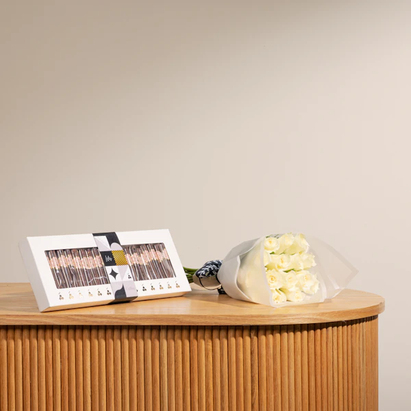 الأسعار شاملة الضرائبعلبة شوكولاتة سيجار من شان شال | 15 وردة بيضاء