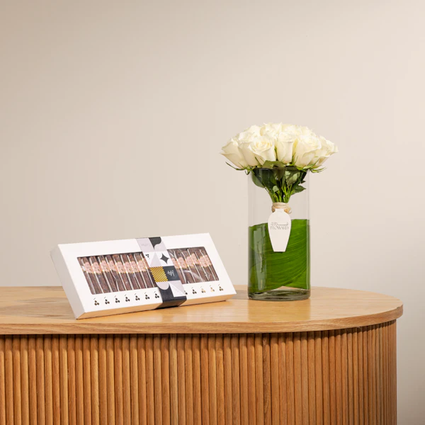 الأسعار شاملة الضرائبعلبة شوكولاتة سيجار من شان شال | 20 وردة بيضاء