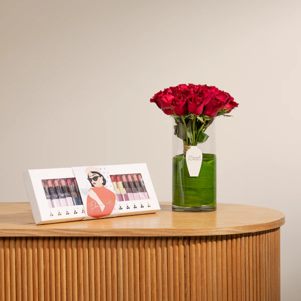 اجعل كل مناسبة لا تُنسى مع مجموعة الهدايا الفاخرة التي تضم مزهرية رائعة مكونة من 20 وردة حمراء مذهلة وعلبة شوكولاتة علبة شوكولاتة بشكل احمر شفاه من شان شال. الجوري الحمراء التي ترمز إلى الحب العميق والشغف، بينما تقدم الشوكولاتة الفاخرة تجربة مذاق فاخرة. هذا المزيج الفريد مثالي للتعبير عن أعمق المشاعر والاحتفال باللحظات الخاصة بأناقة. أضف لمسة من الرومانسية والرقي إلى يوم أحبائك. اطلب الآن لتفاجئهم بهدية تنبض بالعاطفة والجمال.
