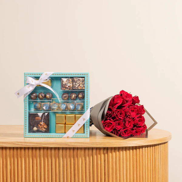انغمس في علبة شوكولاتة شانشال الفيروزية الفاخرة التي تحتوي على 23 قطعة من الشوكولاتة الرائعة المثالية لأي مناسبة. تأتي هذه الهدية المبهجة مقترنة بشكل جميل مع 25 وردة حمراء نابضة بالحياة، مغلفة بأناقة في غلاف أسود أنيق. مزيج الشوكولاتة الغنية والجمال الكلاسيكي للورود الحمراء يجعلها هدية مثالية للتعبير عن الحب أو الامتنان أو الاحتفال. ارفع تجربة إهدائك مع هذا الطقم الأنيق من شانشال، المصمم ليترك انطباعًا دائمًا على أحبائك.