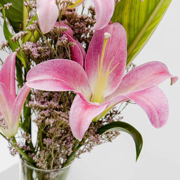 هذا المزيج المبهر من الليليوم الوردية، واللافندر البنفسجي، مع أوراق الأستريليتزيا الخضراء هو الهدية المثالية. تم تنسيق الزهور داخل مزهرية أسطوانية أنيقة ليصنعا معًا لوحة فنية مبهجة وجميلة. تشتهر هذه الزهور بألوانها الزاهية، وشكلها الفريد، ومظهرها الرقيق. تباين الألوان يعطي أحساس بالدافئ ويجعلها هدية مميزة تصلح للعديد من المناسبات السعيدة. كما أن المزهرية الأسطوانية تساعد على إبراز الأزهار وتوفر مظهرًا عصريًا وأنيقًا. هذه المجموعة مثالية للتعبير عن حبك وتقديرك لأحبائك.