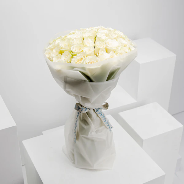 باقة من 50 وردة جورية بيضاء في لفتة كلاسيكية وأنيقة من الحب والامتنان والإعجاب. الورود الرقيقة والعطرة تم تنسسيقها ولفها بغلاف أبيض بنعومة وأنسيابية لانهائية. يمكنك اهداء هذه الباقة لمن تحب، فتتناغم تمنياتك الطيبة لهم مع نقاء وصفاء اللون الأبيض للورد الجوري، من المؤكد أن هذه الهدية ستبث السعادة في قلب من تحب وتبقى ذكرى سعيد ليوم مميز.