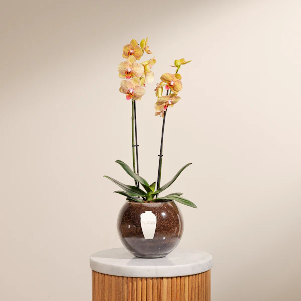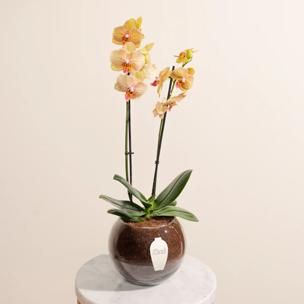 أضف لمسة من الأناقة إلى أي مكان مع نبات الأوركيد البرتقالي  في وعاء زجاجي دائري. يعرض هذا الترتيب الرائع ألوان الأوركيد الزاهية، مما يخلق قطعة مركزية بصرية مذهلة. مثالي لأي مناسبة، يضفي هذا النبات الجميل لمسة من الألوان والشعور بالهدوء إلى منزلك أو مكتبك. سواء كهدية أو للاستمتاع الشخصي، ستبهر نبتة الأوركيد الملونة في وعاء زجاجي دائري الجميع وتسعدهم.