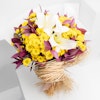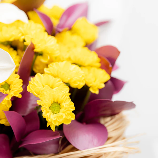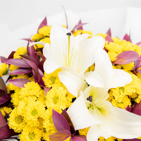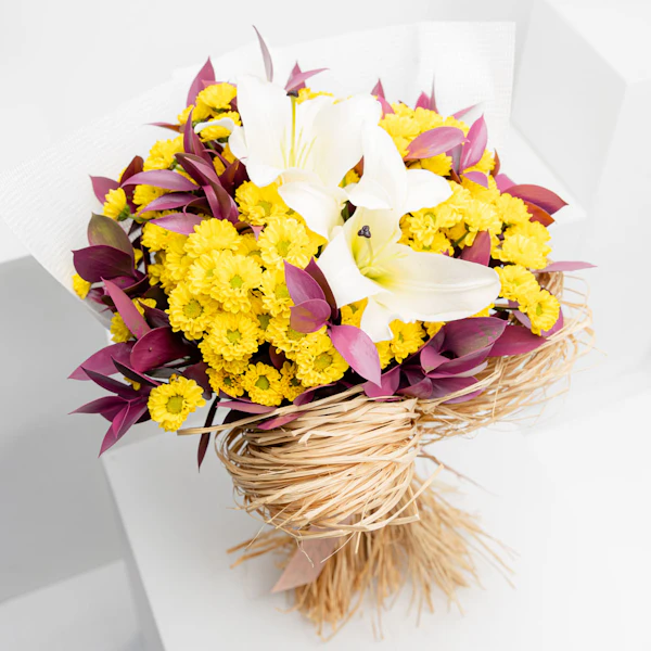 باقة رقيقة وأنيقة في انتظارك في شكل ترتيب من اقحوان الأصفر الليليوم الأبيض، ملفوفة بعناية في تغليف أبيض نقي. تقدم زهور اقحوان الصفراء الزاهية لمسة من الدفء والبهجة، بينما تنبعث الليليوم البيضاء النقية بأجواء من السكينة والأناقة. معًا، يخلقون مزيجًا متناغمًا من الألوان والعواطف يناسب أي مناسبة. سواء كنت ترغب في إضاءة يوم شخص ما أو الاحتفال بلحظة خاصة، فإن هذا العمل الفني الزهري مؤكد أنه سيعبر عن مشاعرك بأناقة وأناقة.