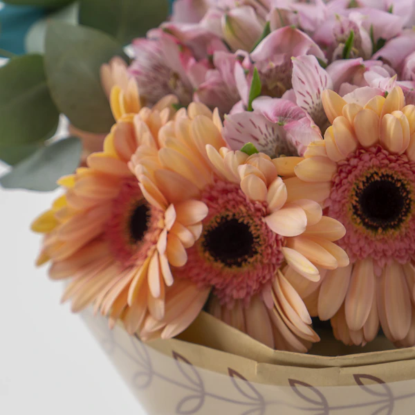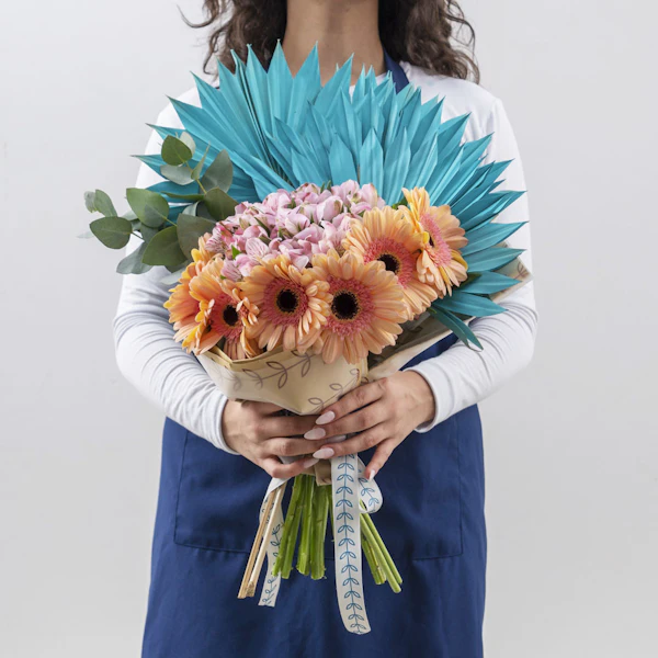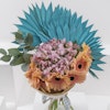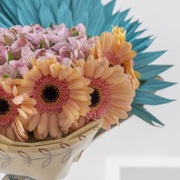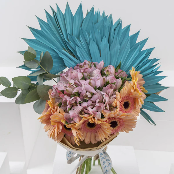هذه الباقة فريدة وساحرة, ملونة بألوان الباستيل الناعمة مع تباين مذهل مع مراوح الزينة باللون الأزرق.