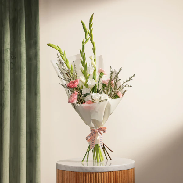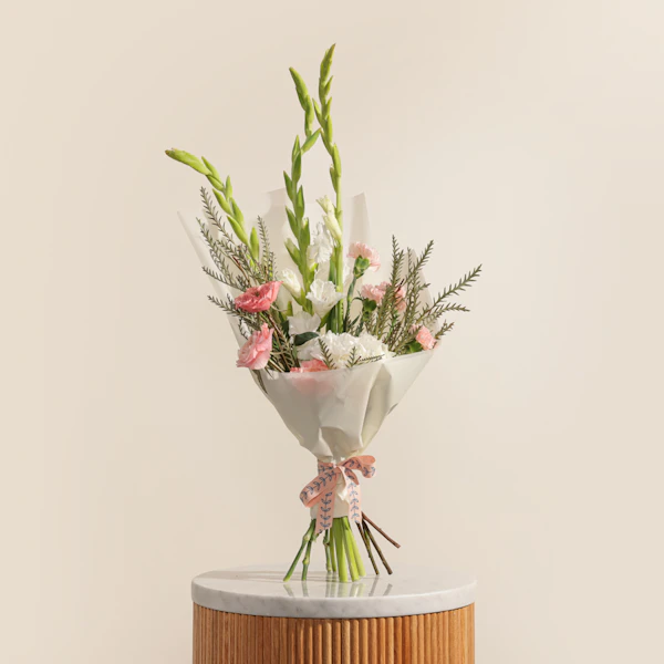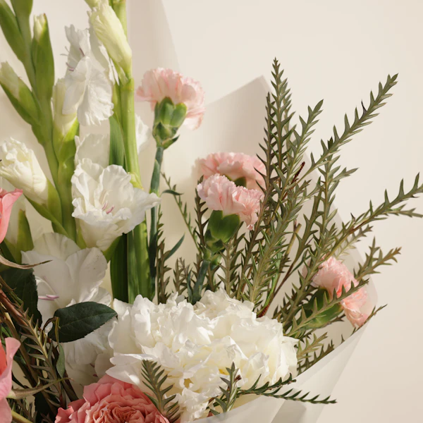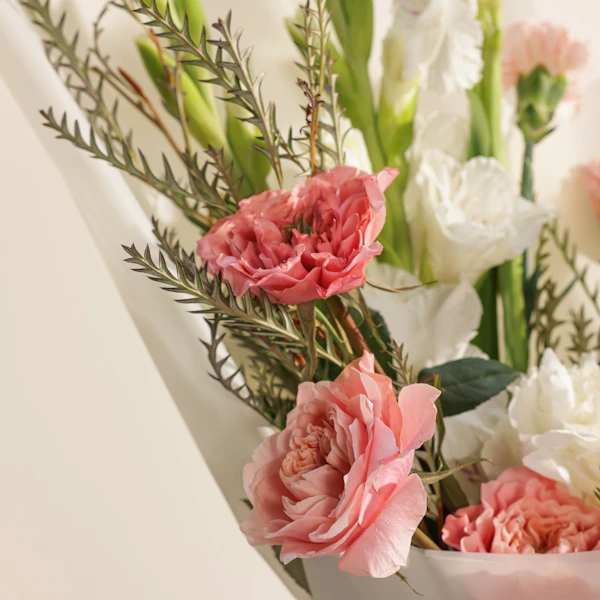 اجعل لحظاتك أكثر إشراقًا مع باقة الهيدرانجيا البيضاء، والكارنشين الوردي، والجوري الوردي، والغلاديلاس الأبيض، المغلفة في غلاف أبيض أنيق. تعبر هذه الباقة عن مزيج من النعومة والجمال الساحر، حيث تجتمع الألوان الوردية الرقيقة مع البياض النقي لخلق تناغم مثالي. الهيدرانجيا البيضاء تضيف لمسة من الفخامة، بينما يضفي الكارنشين والجوري الوردي لمسة من الرومانسية والدفء. الغلاديلاس الأبيض يعزز جمال الباقة بلمسته الرقيقة. سواء كنت تحتفل بمناسبة خاصة أو ترغب في إضفاء لمسة من الجمال إلى منزلك، فإن هذه الباقة ستجلب السعادة والبهجة لكل من يراها. هدية مثالية تعبر عن مشاعرك بأناقة ورقي.