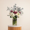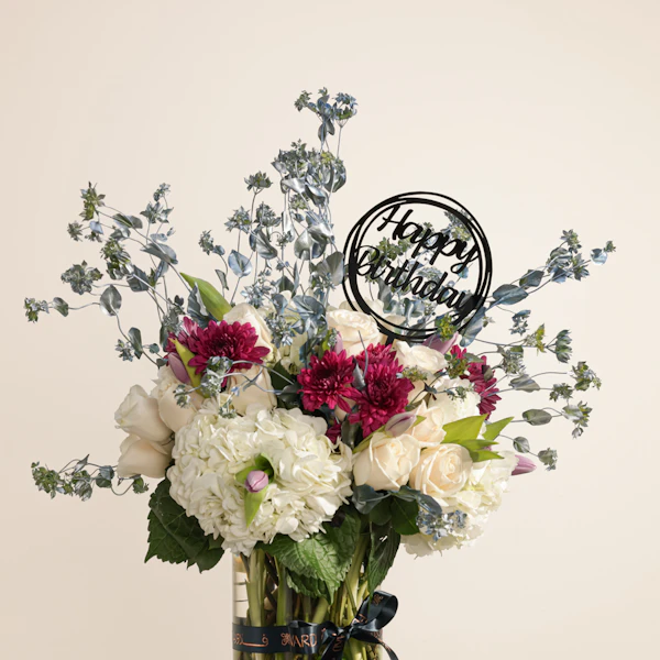 احتفل بعيد ميلاد من تحب بطريقة لا تُنسى مع فازة زجاجية أنيقة مليئة بالورود البيضاء النقية والبنفسجية الراقية، في تناغم يعكس الجمال والأناقة. هذا التنسيق الزهري الكلاسيكي يضفي لمسة من الرقي والتميز على يوم ميلادهم، ويجعل اللحظة أكثر سحرًا وبهجة. إنها الهدية المثالية لتعبّر عن مشاعرك بأجمل طريقة، وتحتفل بأناقة ورقي مع من تحب.