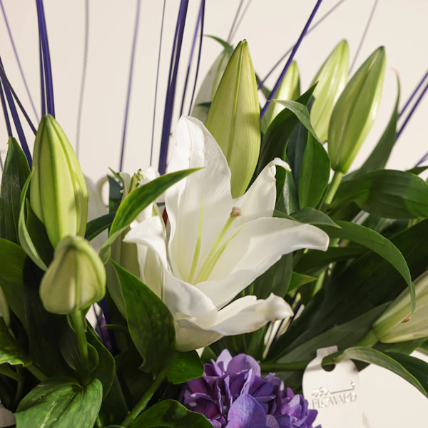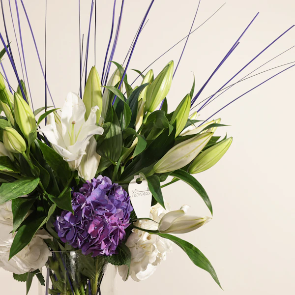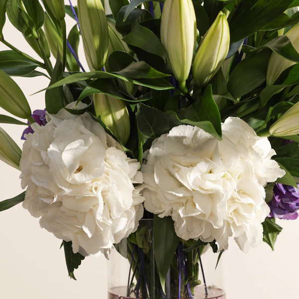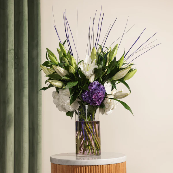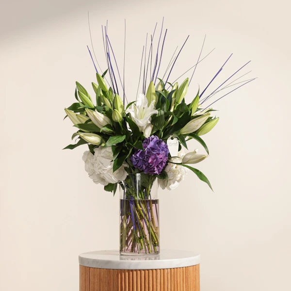 أضف لمسة من البهجة إلى يوم أحبائك مع ترتيبتنا الرائعة من هيدرانجيا بنفسجية وبيضاء وليلوم أبيض! مزينة بعناية في مزهرية زجاجية أسطوانية أنيقة، تعرض هذه الباقة جمال الهيدرانجيا، زهرة الموسم لهذا الوقت من السنة، بكل روعتها. الألوان الزاهية والليلوم الرقيق يشكلان مزيجاً جميلاً يترك انطباعاً دائماً. سواء كانت لعيد ميلاد، ذكرى، أو فقط للتعبير عن الحب، سيشعر أحباؤك بالتقدير والاهتمام. لا تفوت الفرصة—أضف لمسة من الأناقة إلى حياتهم اليوم! اطلب الآن واجعل يومهم مميزاً!