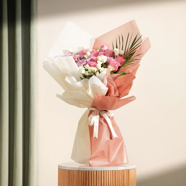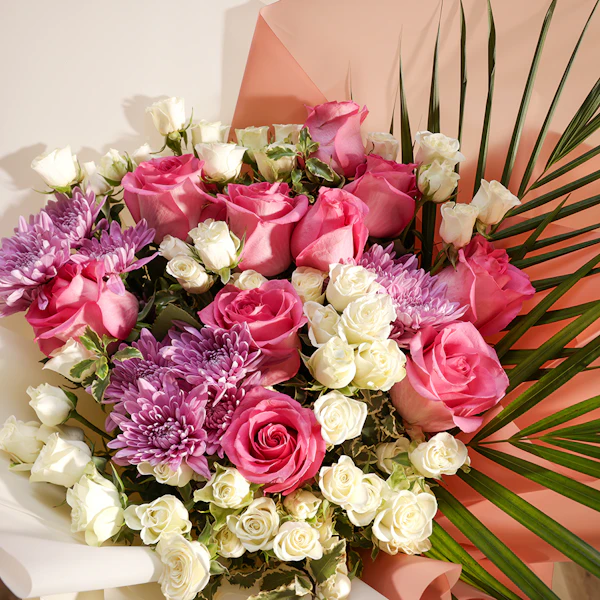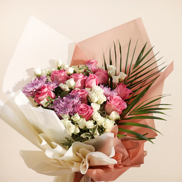 احتفلي بالرابطة الأخوية مع باقة يد التناغم المتألقة للأخت، وهي عبارة عن ترتيب زهور مذهل مصمم للتعبير عن عاطفتك الصادقة. تتميز هذه الباقة بالجوري الوردية الناعمة والجوري البيضاء الرقيقة والأقحوان الوردي النابض بالحياة، وهي معززة بزهرة بيتوسبوروم الخصبة وأوراق النخيل الأنيقة لإضفاء لمسة من الأناقة. يتم تقديمها كباقة يد ومزينة بعود تزيين أكريليك مكتوب عليه "أختي نصفي الثاني"، إنها هدية مثالية لأي مناسبة. سيضفي هذا الترتيب الجميل البهجة على يومها ويذكرها بالرابط الخاص الذي تتقاسمانه.