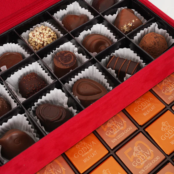 - صندوق شيكولاته رويال صغير من جوديفا: 15 قطعة برالين و ترافل و 30 قطع كاريه