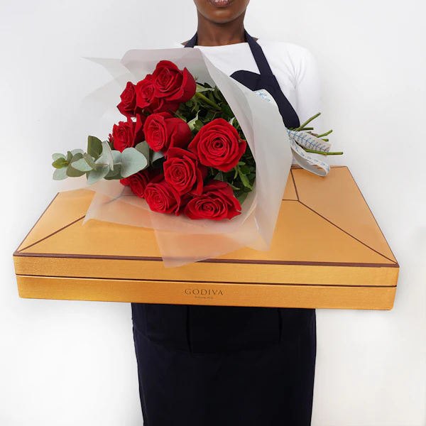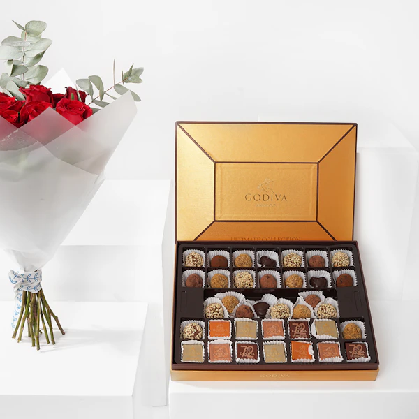 SKU FC27361أظهر حبك في يوم الحب مع هدية خاصة من جوديفا - علبة شوكولاتة صغيرة مليئة بـ 28 قطعة شوكولاتة رائعة و12 قطعة بسكويت لذيذة. تقترن هذه الهدية المبهجة بباقة جميلة مكونة من 12 جوري حمراء، مرتبة بشكل أنيق وملفوفة في غلاف أبيض نقي. هذا المزيج المدروس من الشوكولاتة الفاخرة والبسكويت اللذيذ والورود الامعة هو لفتة لطيفة للتعبير عن حبك. تشكل علبة شوكولاتة جوديفا الصغيرة وباقة الورد الساحرة مزيجًا مثاليًا من الدلال والرومانسية، مما يجعلها هدية مثالية لتجعل أحبائك يشعرون بالاعتزاز في هذا اليوم المميز. اطلب الآن لتشارك فرحة يوم الحب مع هذه المجموعة الجميلة.