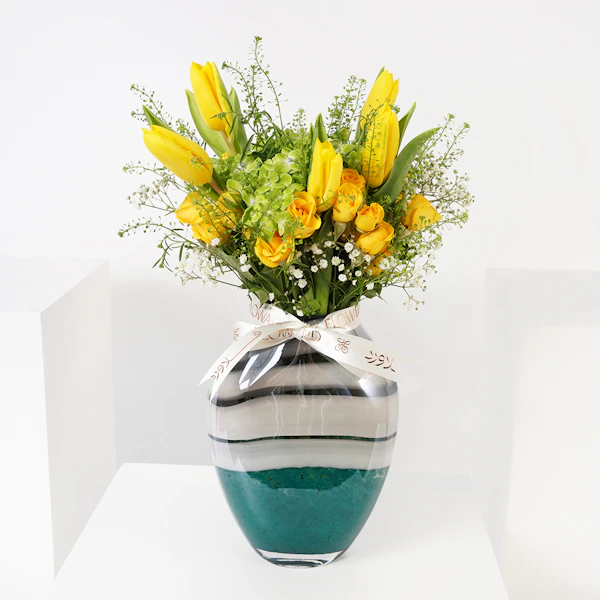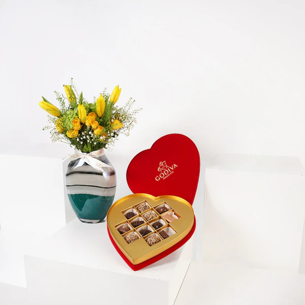 QAR480احتفل مع من تحب بعلبة شوكولاتة جوديفا ريد هارت الفاخرة، وهي مجموعة مبهجة مكونة من 12 قطعة رائعة. هذه الهدية المزينة بلوح أكريليك ست الحبايب هي تعبير مثالي عن الحب. ترافق الشوكولاتة مزهرية زجاجية فاخرة، مزينة بأناقة زهرة بيبي روز باللون الأصفر وسحر زهرة التوليب باللون الأصفر النابض بالحياة. يمزج هذا المزيج المدروس بين الانغماس المترف وجمال الزهور الخالد، .