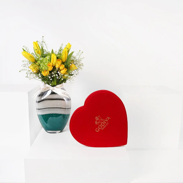 SKU FC93050احتفل مع من تحب بعلبة شوكولاتة جوديفا ريد هارت الفاخرة، وهي مجموعة مبهجة مكونة من 12 قطعة رائعة. هذه الهدية المزينة بلوح أكريليك ست الحبايب هي تعبير مثالي عن الحب. ترافق الشوكولاتة مزهرية زجاجية فاخرة، مزينة بأناقة زهرة بيبي روز باللون الأصفر وسحر زهرة التوليب باللون الأصفر النابض بالحياة. يمزج هذا المزيج المدروس بين الانغماس المترف وجمال الزهور الخالد، .