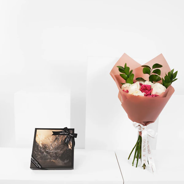 SKU FC05792احتفل بحلاوة الحب مع علبة شوكولاتة الحب من سويزرلاند، التي تحتوي على 25 قطعة من الشوكولاتة الفاخرة المغطاة بشوكولاتة الحليب الكريمية. كل قضمة عبارة عن مزيج مبهج من الترافل والبرالين، مما يجعلها مثالية للاستمتاع بلحظات من المودة. ترافق هذه الهدية اللذيذة بالأناقة الخالدة لورود الجوري البيضاء، والجاذبية الساحرة لورود الجوري الفوشيا، والخضرة الوارفة لنبات الرسكوس. .