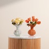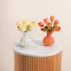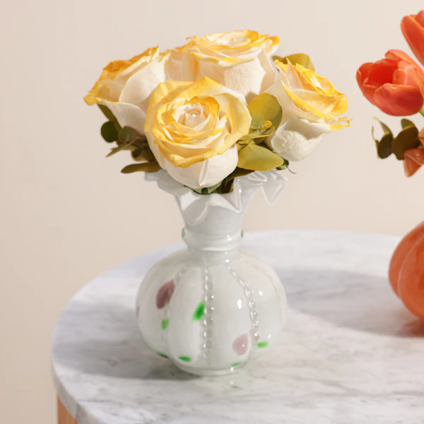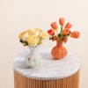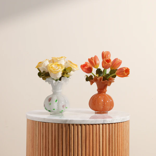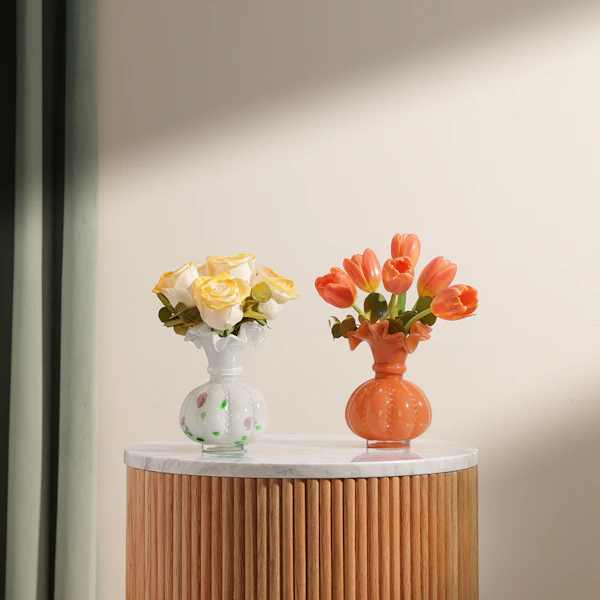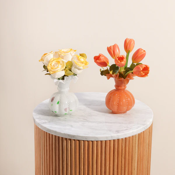 ثنائي الزهور المتألقة هو الهدية المثالية لمن يحب التميز والجمال الكلاسيكي. تتألف هذه الهدية الرائعة من باقتين ساحرتين؛ الأولى ورود جوري بيضاء نقية مزينة بأوراق الأوكالبتوس العطرية، مرتبة بعناية في مزهرية فينتون عتيقة زجاجية باللون الأبيض، مما يضفي لمسة من الفخامة والرقي. أما الثانية فهي زهور توليب برتقالية مشرقة، مزينة بأوراق الأوكالبتوس المنعشة، وتأتي في مزهرية فينتون عتيقة زجاجية باللون الوردي، لتكمل المشهد برقيّ لا مثيل له. هذه الهدية تضفي جمالاً على أي مكان وتعبّر عن الذوق الرفيع، مما يجعلها الهدية المثالية للمناسبات الخاصة والتهادي بأناقة لا تُنسى.