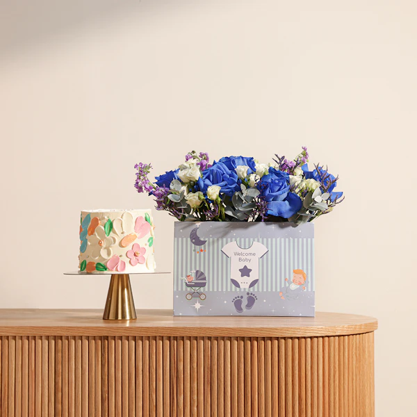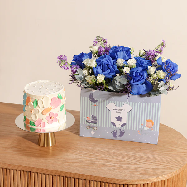 احتفل بقدوم المولود الجديد مع هدية مميزة تليق بهذه المناسبة الخاصة. سواء كنت ترغب في تزيين غرفة المستشفى أو تقديمها كهدية لحفل استقبال المولود، فإن هذه الهدية تجمع بين الجمال والأناقة. تتضمن كيك البتلات الملونة من فلاورد، الذي يجمع بين نكهات الفانيليا الغنية والبندق اللذيذ والشوكولاتة الداكنة الفاخرة. تأتي هذه الكيكة المميزة مع تنسيق ساحر من زهور الجوري الزرقاء والبيبي جوري البيضاء، بالإضافة إلى أوراق الأوكالبتوس التي تضفي لمسة من الانتعاش والطبيعة. الزهور تأتي في حقيبة أنيقة مكتوب عليها عبارة "أهلًا بالمولود الجديد"، لتكون ذكرى جميلة للأيام الأولى للمولود. إنها الهدية المثالية للاحتفال بالمولود الجديد بكل أناقة وتميز. لا تتردد في شراء هذه الهدية الفريدة الآن!