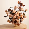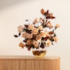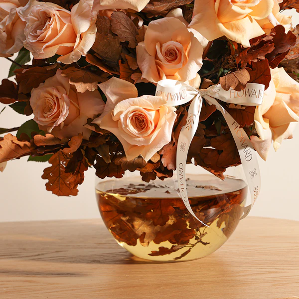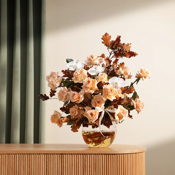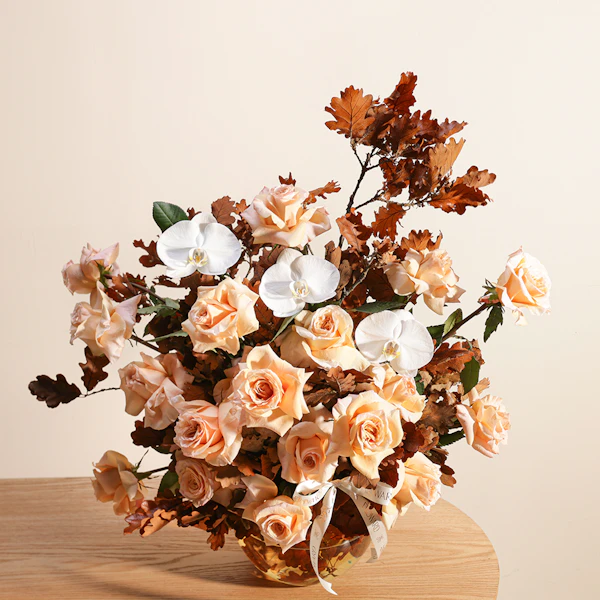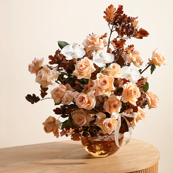 أضف البهجة إلى أي مناسبة بهذة المزهرية الرائعة . يبرز هذا الترتيب الأنيق الجمال الناعم لجوري البرتقالي الفاتح وسحر زهرة الأوركيد البيضاء الخالدة، ويكمله درجات اللون البرتقالي لأوراق البلوط المحفوظة. تضيف أوراق الأسبيدسترا الخصبة لمسة من الخضرة، وكلها معروضة بشكل جميل في مزهرية زجاجية أنيقة. مثالية للاحتفال باللحظات الخاصة أو ببساطة إضافة لمسة من الأناقة إلى أي مساحة، تقدم هذه الباقة مزيجًا متناغمًا من الألوان والملمس، مما يخلق هدية راقية لا تُنسى. احتفل بأناقة مع هذة المزهرية الرائعة .