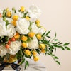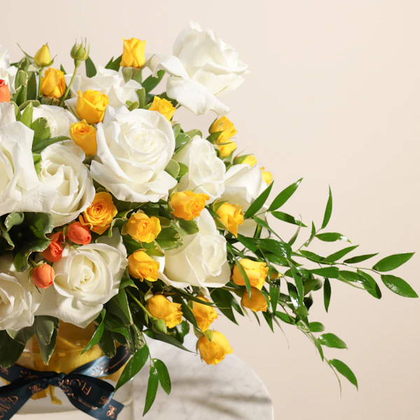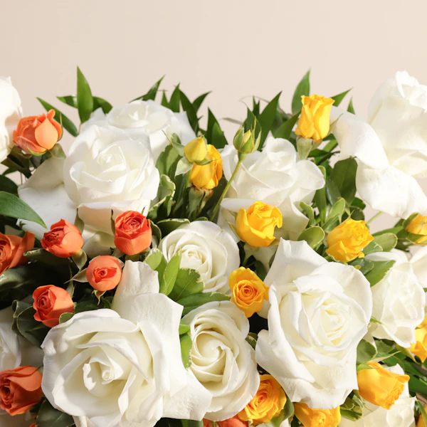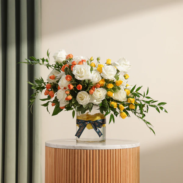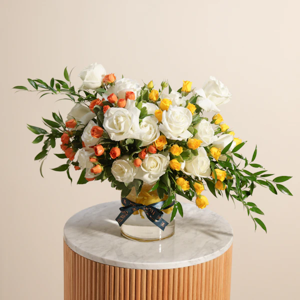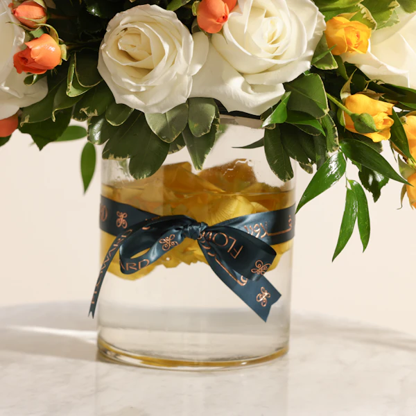 أضف البهجة إلى أي مناسبة مع مزهرية الأناقة المضيئة. تتميز هذه المزهرية الرائعة باللون الأبيض النقي للجوري والبرتقالي والأصفرللبيبي جوري النابض بالحياة البهيج والتي تتكامل بشكل مثالي مع أوراق البيتوسبوروم والروسكوس الإيطالي. تُعرض هذه الباقة في مزهرية زجاجية اسطوانية أنيقة، وتشع بمزيج متناغم من الألوان والأنسجة. مثالية لإضفاء البهجة على اللحظات الخاصة أو ببساطة نشر الفرح، تضفي باقة الأناقة المضيئة لمسة من الرقي والدفء على أي مكان. احتفل بنفحة من أشعة الشمس والنعمة واختر هذه المزهرية الرائعة لترك انطباع دائم.