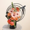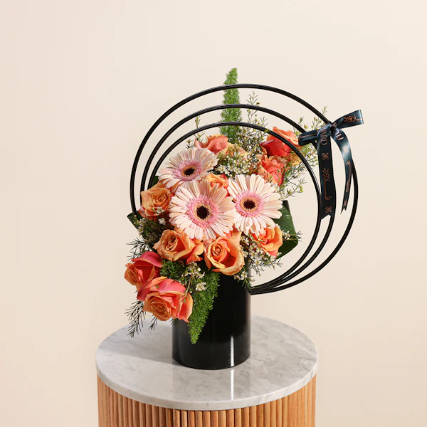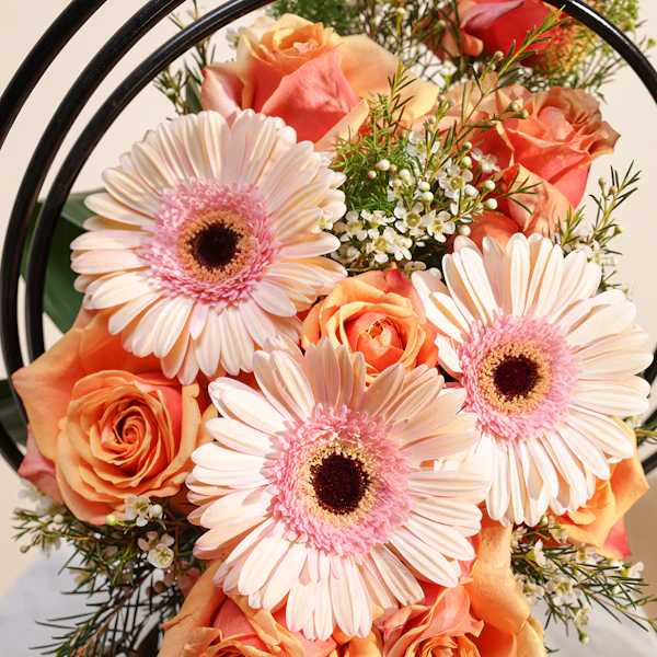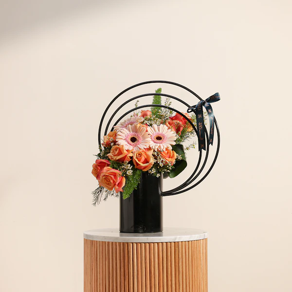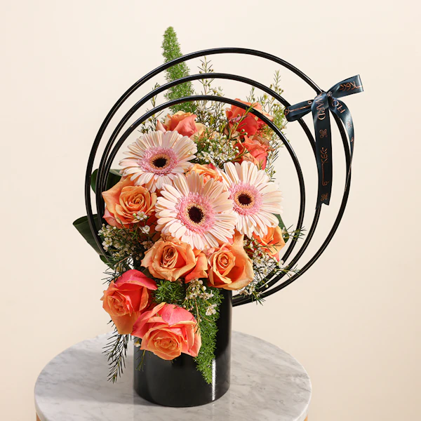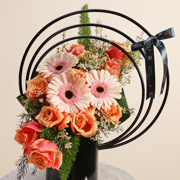 أضف البهجة إلى أي يوم مع مزهرية الأزهار المميزة لدينا. تتميز هذه المزهرية الجذابة بدرجات اللون الغنية للجوري شيري براندي وسحر الجربارة البرتقالي الفاتح وكلها معروضة بأناقة في مزهرية معدنية أنيقة. يخلق مزيج الألوان النابضة بالحياة والملمس الخصب باقة مذهلة ومتطورة مثالية للاحتفال باللحظات الخاصة أو التعبير عن أفكارك ببساطة. بفضل مزهرية معدنية حديثة ومزيج متناغم من الزهور من المؤكد أن باقة الزهور المتألقة ستترك انطباعًا لا يُنسى وعزيزًا.