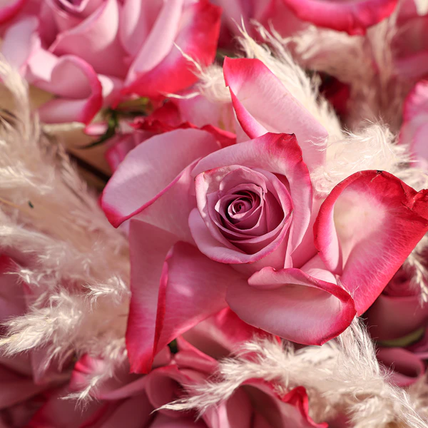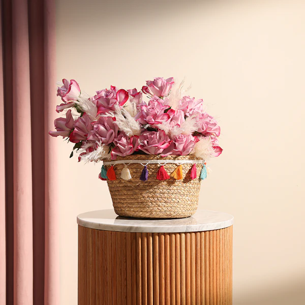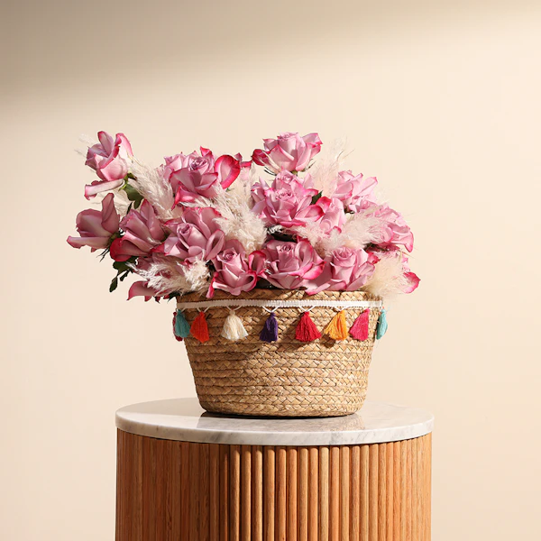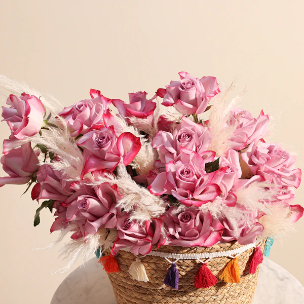 استمتع بلحظات السكينة والجمال مع ترتيب زهور ينبض بالجمال والأناقة، مثالي لكل المناسبات. تتألق هذه الباقة الأنيقة بألوان الجوري البنفسجي المذهل، مع لمسة من بامباس المجفف، وتقدم بأناقة داخل سلة بنية ساحرة. يجمع بين الجمال الخالد والسحر الريفي، مما يجعلها الهدية المثالية للتعبير عن التقدير أو إضفاء البهجة على يوم شخص عزيز. اطلب الآن لإضافة لمسة من الأناقة والهدوء إلى مساحتك، أو لمفاجأة شخص مميز بهذا الترتيب الساحر.