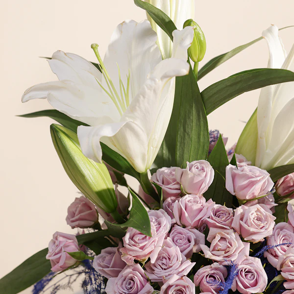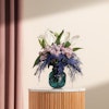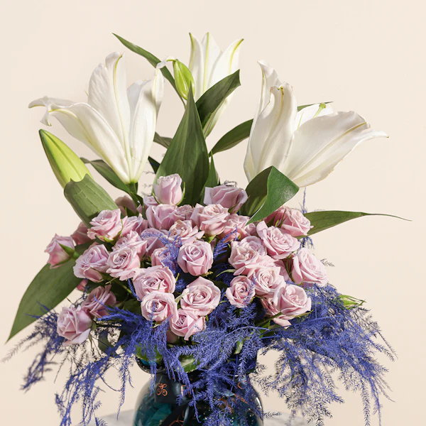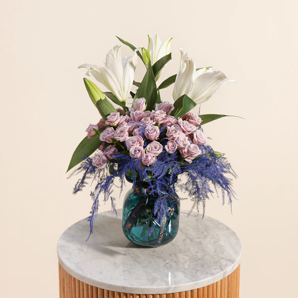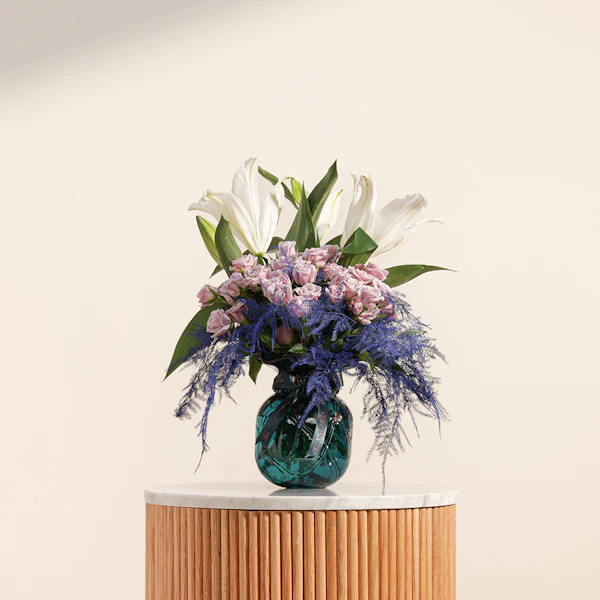 أطلق العنان لمشاعر الحب والجمال مع هذه المزهرية المذهلة التي تخطف الأنظار وتلمس القلوب. يتناغم فيها عبق زهور الليليوم البيضاء النقية التي تهمس برومانسية حالمة. ولإضفاء لمسة من السحر، تبرز الزهور البنفسجية بتفاصيلها لتضفي حيوية خيالية على التنسيق . تأتي هذه الروعة الفنية في مزهرية زجاجية ذات اللون الأخضر الملكي و بخطوط فنية رفيعة لتصبح قطعة متكاملة تعكس دفء المشاعر وبراعة الأختيار. هذا تنسيق يحاكي جمال الطبيعة ويأسر القلوب لذلك فهو هدية مثالية تعبر عن الحب والاهتمام بكل تفاصيله . اطلبها الآن وامنح أحبائك هدية تحمل في طياتها الفخامة والجمال، أو اجعل من منزلك مكانًا ينطق بالأناقة والتألق.