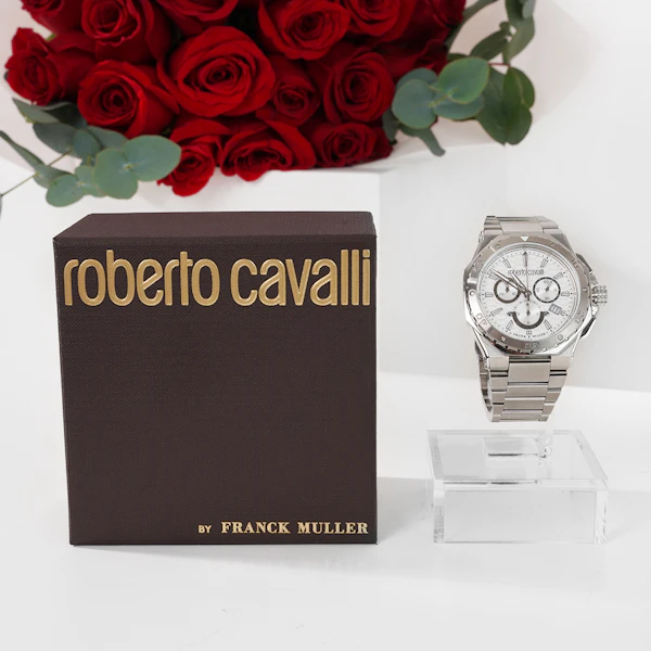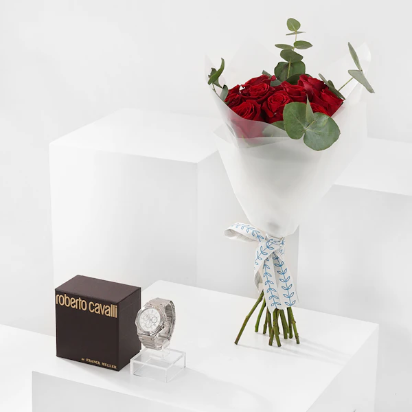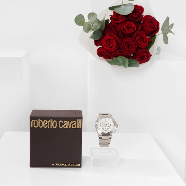 هدية راقية له في يوم الحب مع ساعة روبرتو كافالي من فرانك مولر للرجال، تحفة فنية خالدة مصنوعة من الستلنلس ستيل باللون الفضي. تجمع هذه الساعة الاستثنائية بين الأناقة والأداء بسلاسة، مما يجعلها هدية مميزة له في يوم الحب. تأتي الساعة مرفقة بباقة مميزة من ورورد الجوري الحمراء مكملة برائحة الأوكالبتوس. التناغم المثالي بين الساعة المصنوعة بدقة وتنسيق ورود الشغف النابضة بالحياة يخلق تعبيرًا رائعًا عن الحب والتقدير. احتفلي معه بيوم الحب بهذه الهدية الفاخرة التي تمزج بين الذوق الرفيع والجمال الدائم وسحر الرومانسية.