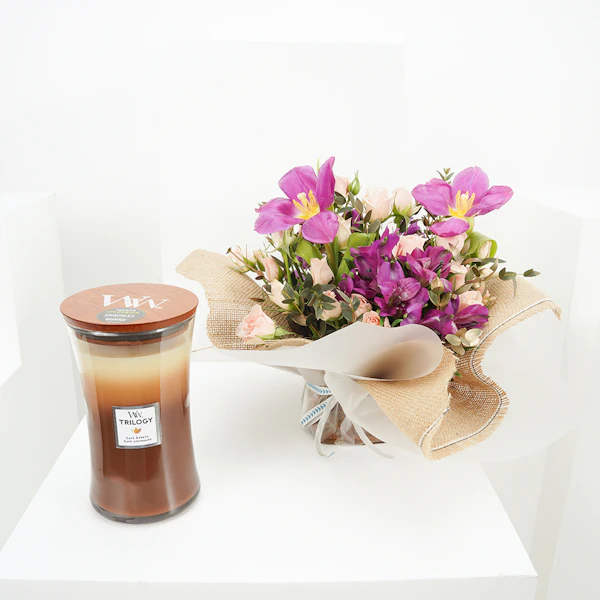 SKU FC87082اهدي شخص عزيز لديك يقدر الهدوء والأشياء الراقية مع شمعة حلويات المقهى الثلاثية الكبيرة من وود ويك على شكل الساعة الرملية. افتح أبواب الراحة والاستمتاع بفضل روائح الفانيليا، الكراميل، والبسكوتي الرائعة. اختبر رفاهية حبوب الفانيليا الأصيلة يتحتضنها رائحة قصب السكر، لتخلق رائحة لا يمكن مقاومتها. يليها الكراميل اللذيذ والسكر البني، المثر بشكل خفي بلمسات من كريمة الفانيليا الناعمة. وتكتمل السمفونية برائحة البسكوتي، التي تنبعث منها رائحة العجين المحمص بحلاوة الفانيليا الغنية. تتناغم هذه الهدية بشكل مثالي مع ترتيب زهور نابضة بالحيوية من التوليب الملكي والألستروميريا البنفسجية الملكية، تحتضنها ورود البيبي جوري بلونها الخوخي الساحر، وأوراق الأوكالبتوس المنعشة. هذه الهدية تعد بتجربة متعددة الحواس من الحلاوة والجمال.