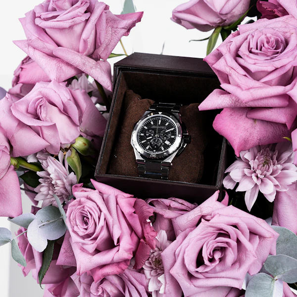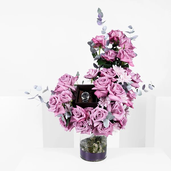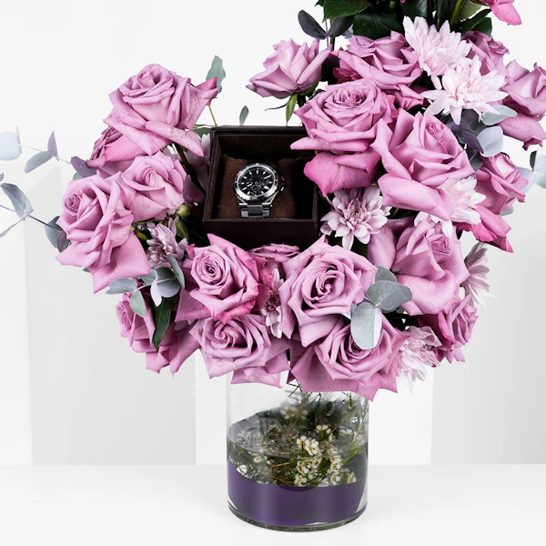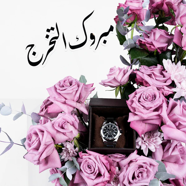 احتفل بحدث مهم مع ساعة روبرتو كافالي من فرانك مولر للرجال، وهي تحفة من الرقي والأناقة. تتميز هذه الساعة المصنوعة من الاستانلس ستيل باللونين الفضي والأسود بأناقة خالدة وجاذبية عصرية، مما يجعلها إكسسوارًا مثاليًا لأي مناسبة. مع مزهرية زجاجية تفيض بالجوري البنفسجية والأقحوان البنفسجي، تشع هذه الهدية بسحر ملكي وتهانينا القلبية. مزينه بعود تزيين مبروك التخرج ، إنها لفتة انيقة للاحتفال بإنجاز أحد أحبائك. تجمع هذه المجموعة بين الفخامة والجمال والمشاعر، وهي بمثابة تكريم مناسب لإنجاز بالغ الأهمية.